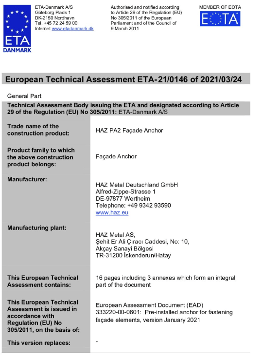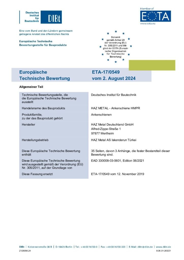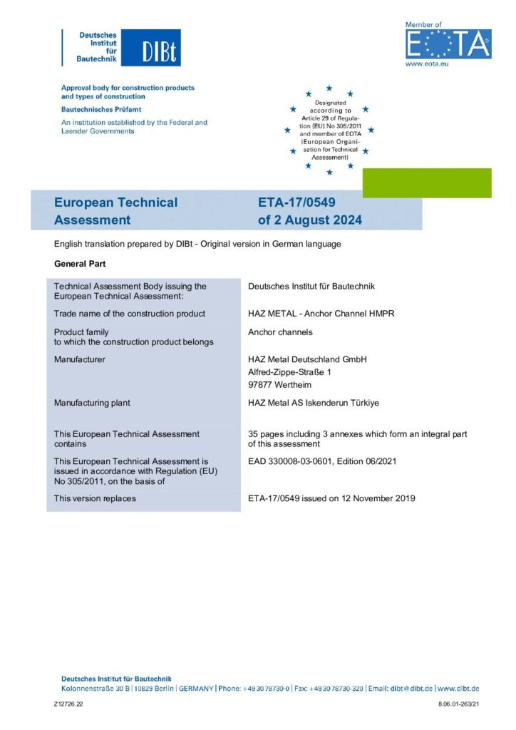 European Technical Assessment (ETA-17-0549) / Anchor Channels HMPR DE