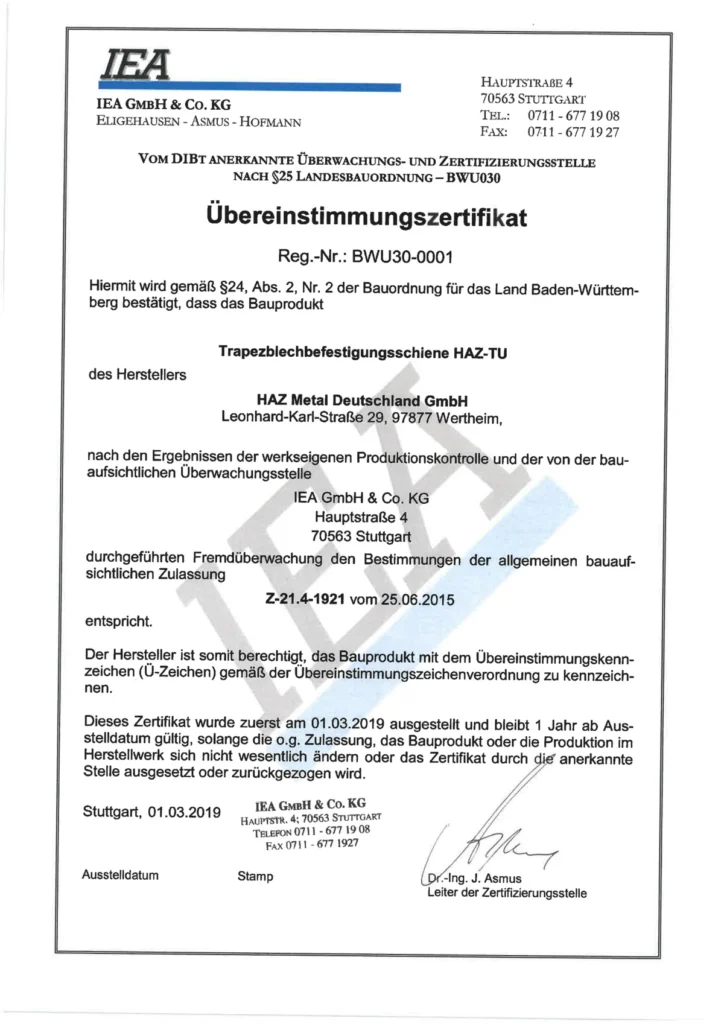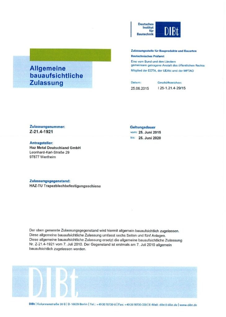 General building inspectorate approval (Z-21-4-1921) / HAZ-TU Channels DE