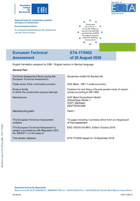European Technical Assessment (ETA-17-0402) HB-11 Undercut Anchor EN