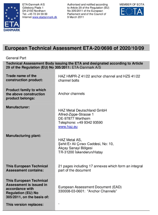 European Technical Assessment (ETA-20-0698) HAZ HMPR-Z 41/22 anchor channel and HZS 41/22 channel bolts