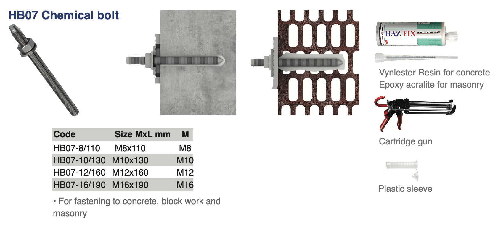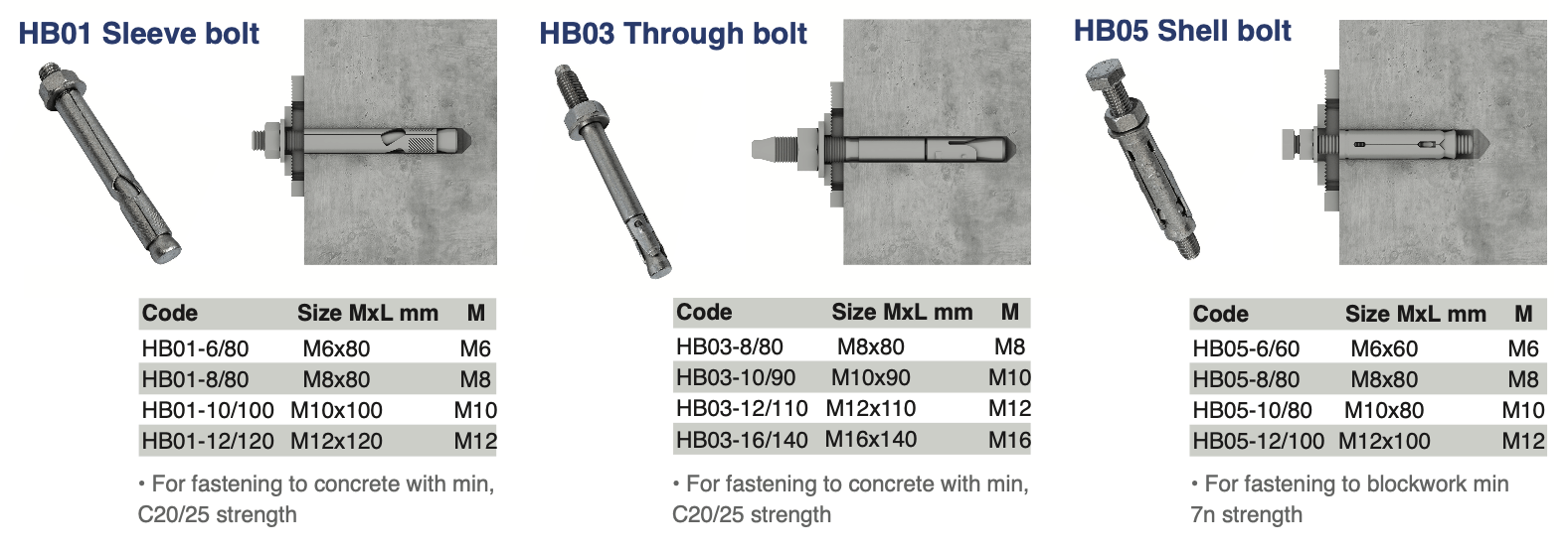 HB anchor bolts are used for fastening components onto load-bearing substrates. There are many types of anchor bolts available for installing fixtures on different base materials.