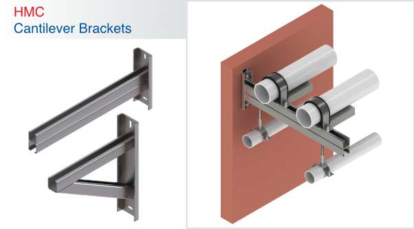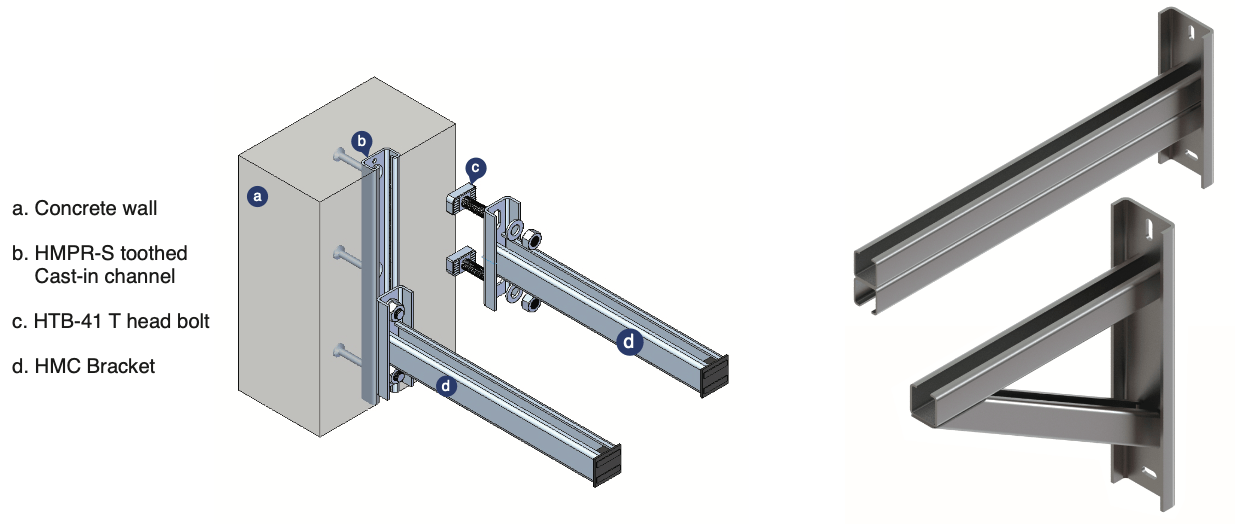 HMC Cantilever brackets provide a reliable solution for installing framing systems onto backing walls. These brackets are securely mounted onto concrete walls using either expansion bolts or T-head bolts fixed on channels.