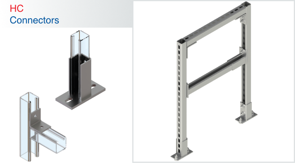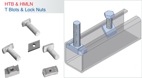 HCC Channel connections are used for mounting framing systems securely together. T-head bolts or lock nut sets are utilized to construct support structures for a wide range of applications.