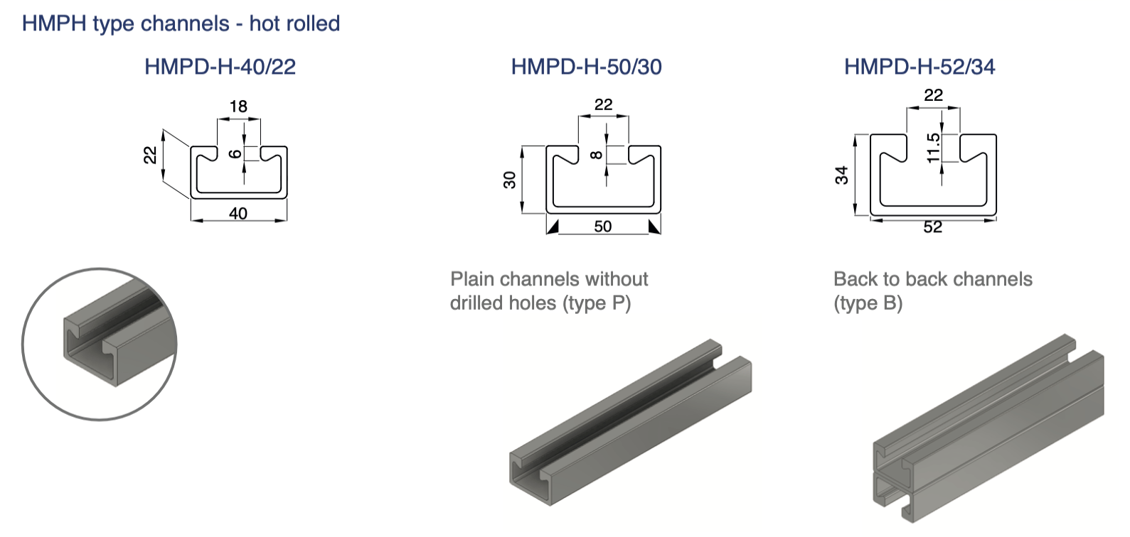 Hot rolled channels are available in both plain and slotted versions, with a maximum length of 6 meters.