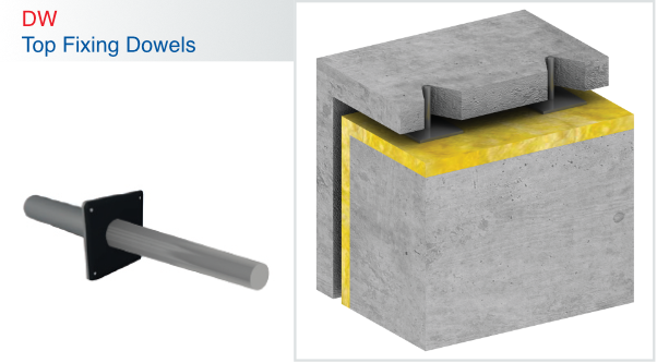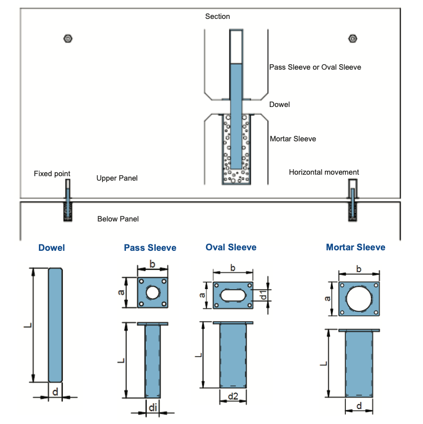 The panel fixing system includes a dowel component that connects each panel at the joints for interlocking and movement purposes. A stainless steel dowel is used, which fits within sleeves that are inserted into the edge of the concrete panels.