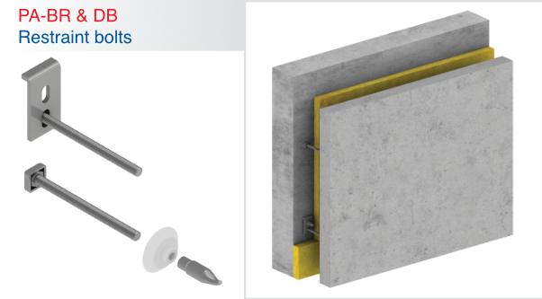 The restraint brackets are designed to secure the panels against wind pressures. The brackets consist of set elements that enable connection into the panels by concrete inserts and an adjustable bracket that is fixed onto the substrate. A threaded stud that connects the bracket to the concrete insert extends up to 400 mm to accommodate the wall cavity.