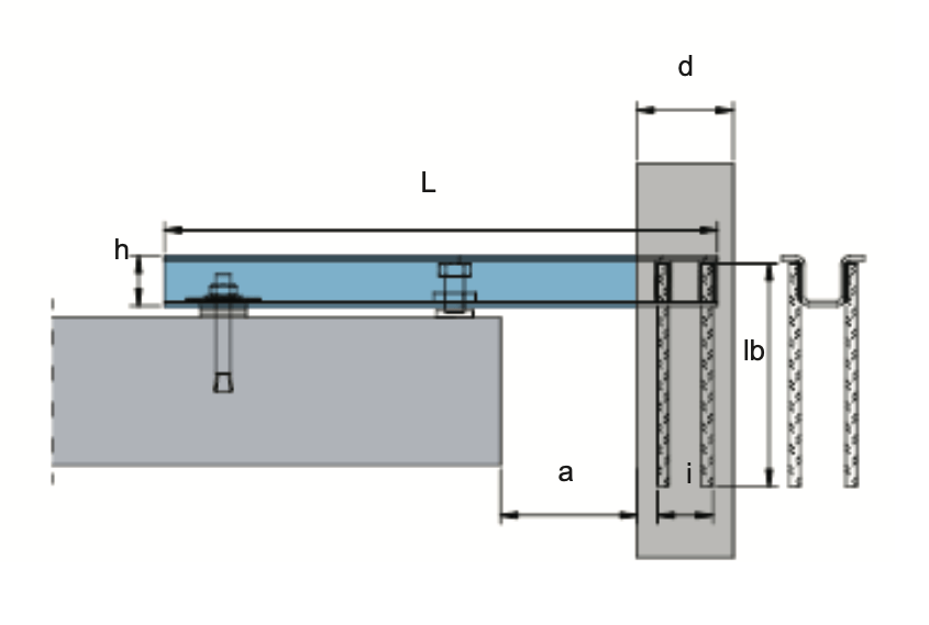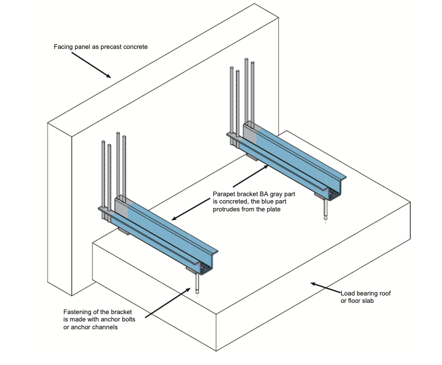 The parapet brackets are partially embedded into the precast concrete component, where the reinforcement is positioned along the precast concrete section. The clamping reinforcement is made of B500B as standard. For higher requirements on the concrete cover, B500A NR steel reinforcement can be used.
