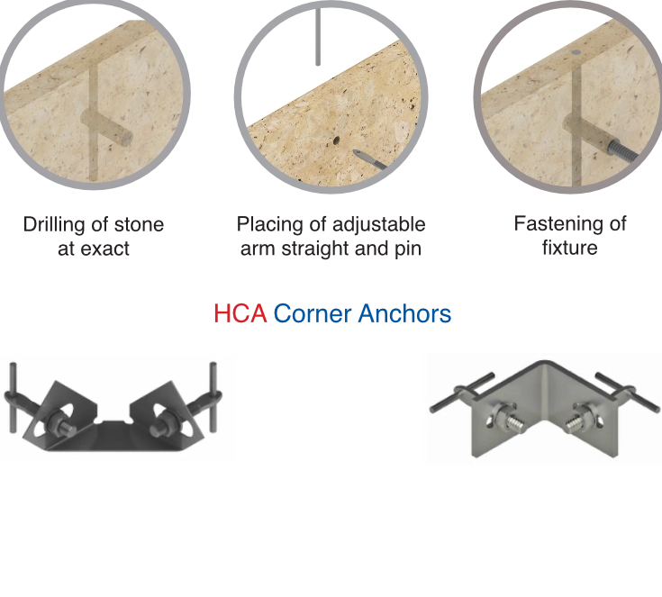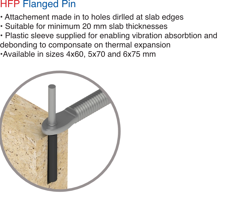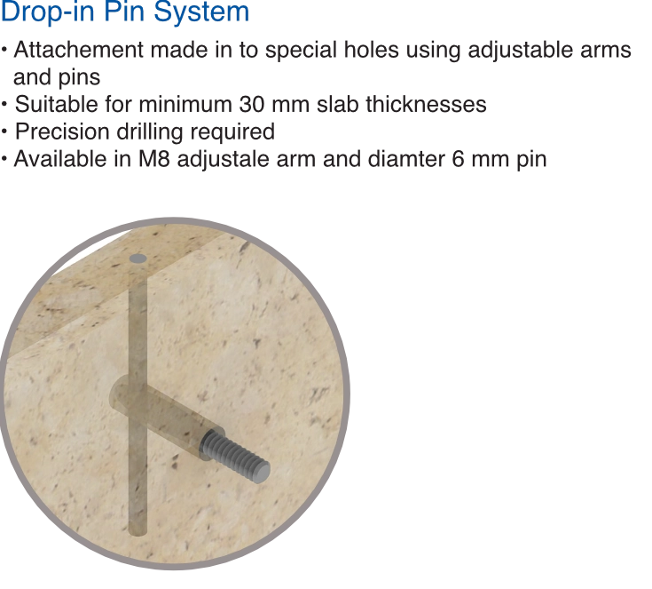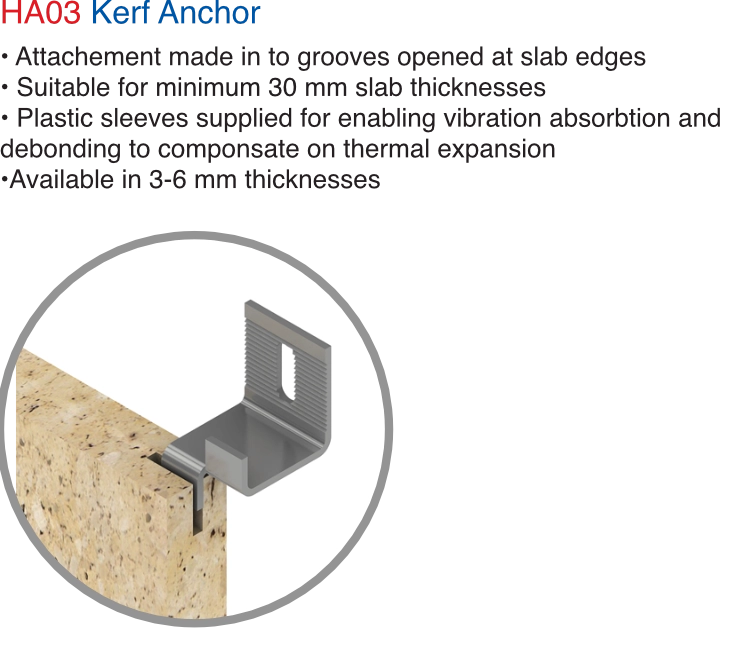 The pin & kerf attachment system is the conventional method for attachments made to stone. A pin hole or a kerf groove is opened at the edge of stone panels. Plastic sleeves are used along with suitable resin to securely attach the pin or kerf in place.
